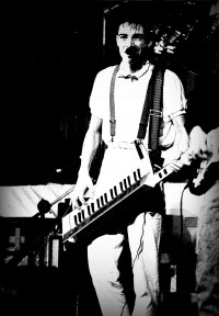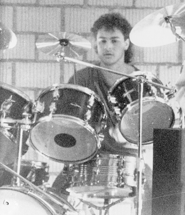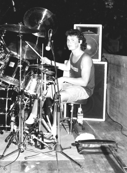 Christian Manzoni war damals absoluter Marillion Fan. Er und Axel kannten sich sehr gut, jammten viel zusammen und tüftelten an neuen Songs. Manzoni wollte auf der Bühne stets eine gute Falle machen und sein Drum musste viel Raum einnehmen. Er war wie wir alle kein überdurchschnittlicher Musiker, hatte aber ebenfalls sehr kreative Ideen. Sein Drum sollte am ersten Konzert 12 Kanäle am Mischpult einnehmen. Blöd war nur, dass anschliessend nur noch 4 Kanäle für den Rest der Band übrig blieb!