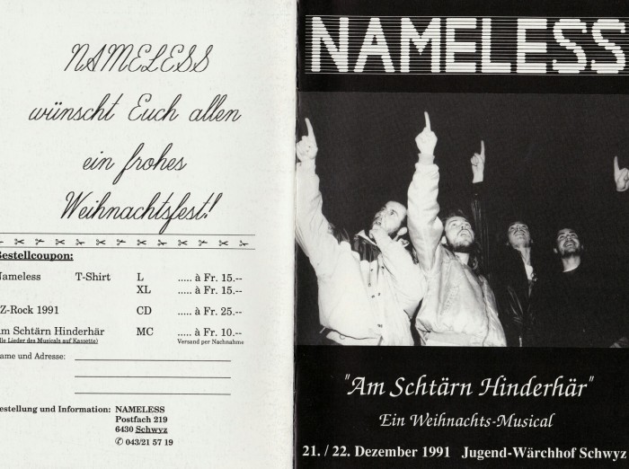Das Musical "Am Schtärn hinderhär", welches am 20. und 21. Dezember 1991 im zweimal vollends ausverkauften Jugendwärchhof Schwyz aufgeführt wurde, war einer der grössten Erfolge von Nameless. Mit dem Musical wollte Nameless seine Kreativität dem grösseren Publikum beweisen, nachdem Hene Heinzer die Band verlassen hatte und gerade keine Alternative für einen Lead-Gitarristen zur Verfügung stand. Harry und Urbi hatten innerhalb von drei Monaten alle Songs geschrieben und die ganze Band musste ab September 1991 die Geschichte schreiben, Darsteller casten und natürlich das ganze Bühnenbild gestalten. Es entstand ein wahnsinniger Zeitdruck, welcher fast nicht zu bewältigen war. Wenn auch lange nichts perfekt war, die rund 150 Zuschauer pro Abend waren begeistert. Im Anschluss an das Musical konnte eine Kassette der Songs für CHF 10 gekauft werden, welche später als CD von Harry und Urbi neu gemastert und eingekleidet wurde. Noch heute gibt es viele Fans, welche beim Musical von einem absoluten Nameless-Highlight sprechen. Beide Abende wurden von einer Video-Kamera von Toni Schuler verfilmt. Das Video vom 21.12.1991 wurde im 2013 von Urbi digitalisert und kann auf dieser Page in den einzelnen Kapiteln angesehen werden. Leider ist das Video vom 20.12.1991 bis heute verschollen.
