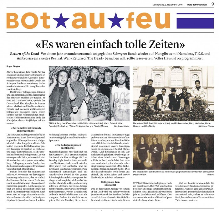 Anfangs 2016 wurde Nameless angefragt, am Event Return of the death im Gaswerk teilzunehmen, an welchem bereits 2015 verschollene Schwyzer Bands mitmachten.
